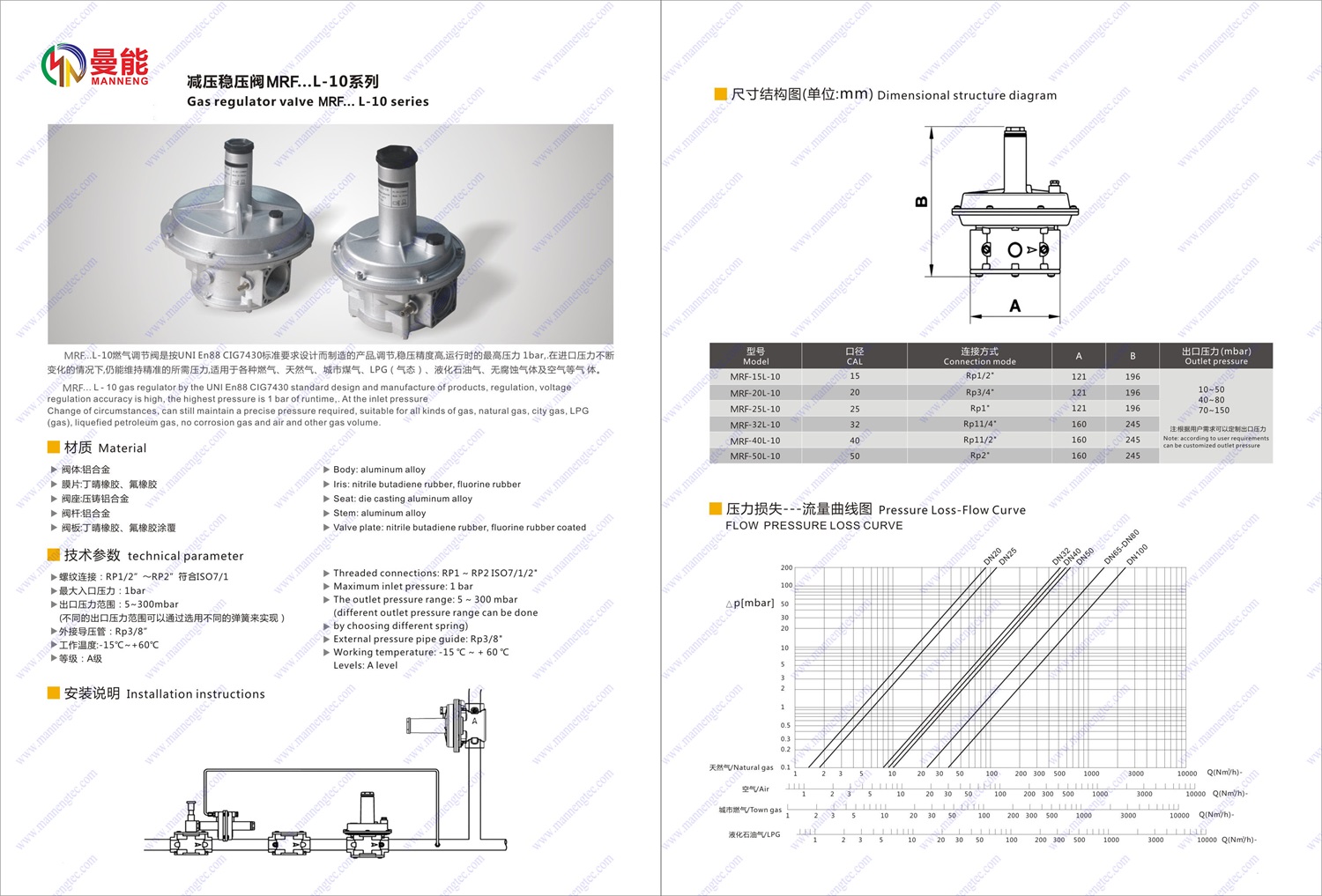 MRF…L-10 series gas regulator by the UNI En88 CIG7430 standard design and manufacture of products, regulation, voltage regulation accuracy is high,the highest pressure is 1 bar of runtime.At the inlet pressure change of circumstances, can still maintain a precise pressure required, suitable for all kinds of gas,natural gas, city gas, LPG(gas), liquefied petroleum gas, no corrosion gas and air and other gas volume.